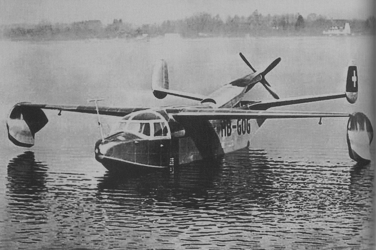 Vue d'un appareil amphibie expérimental à hélice propulsive Do 212, immatriculation HB-GOG. |