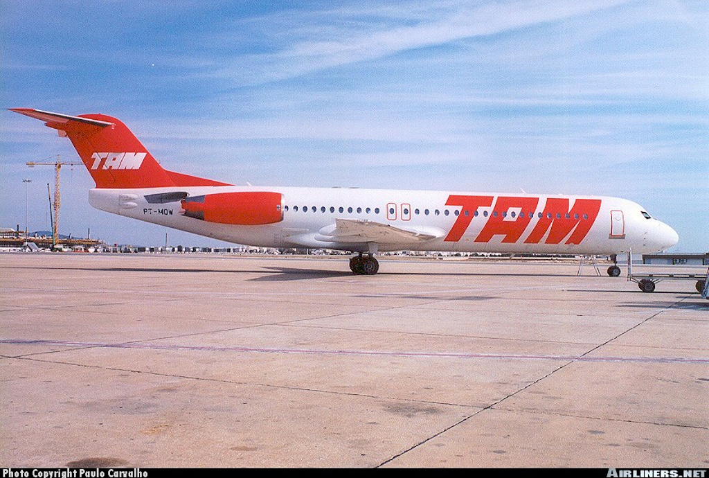 Vue d'un F-100 (F-28-0100) de la compagnie brésilienne TAM (Transportes Aéreos Regionais), immatriculation PT-MQW, cn 11332. Faro, Portugal, novembre 2000. |