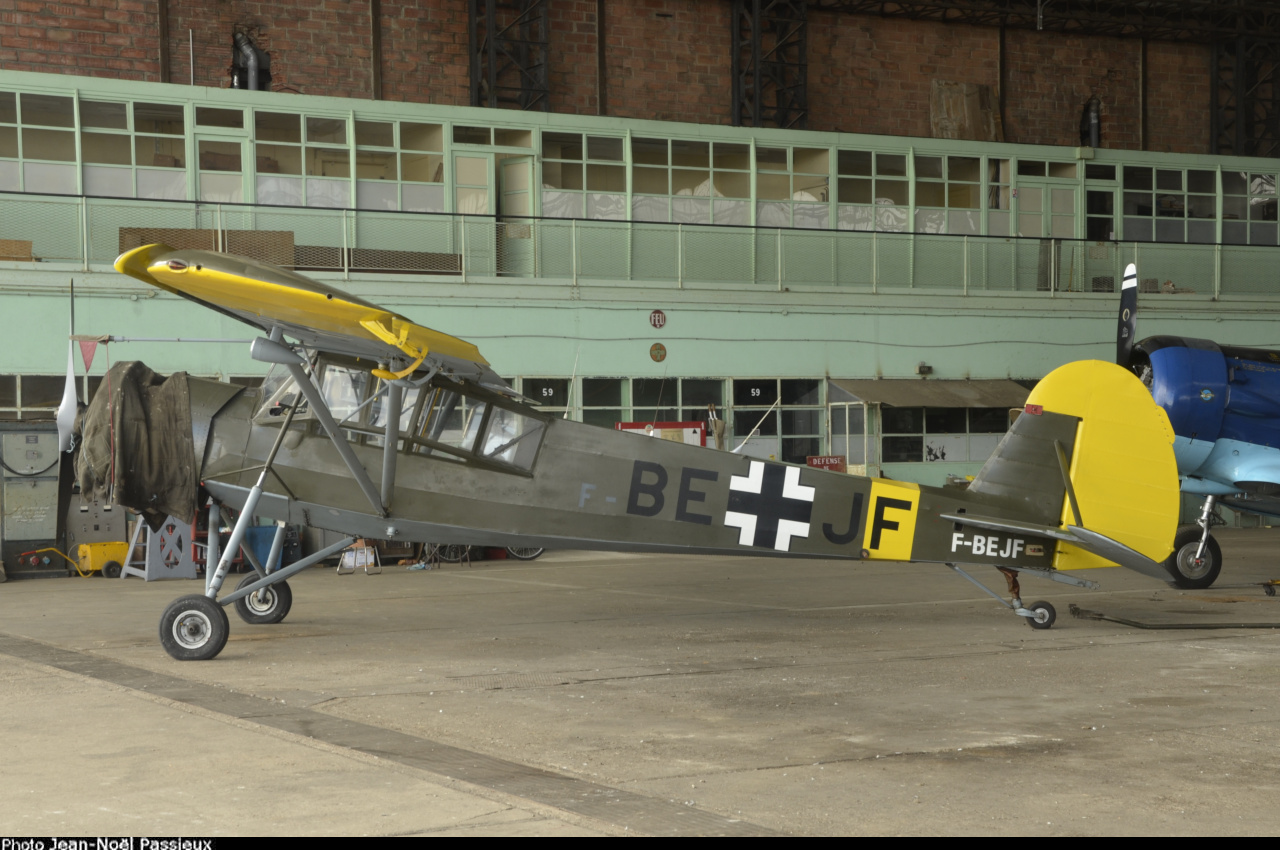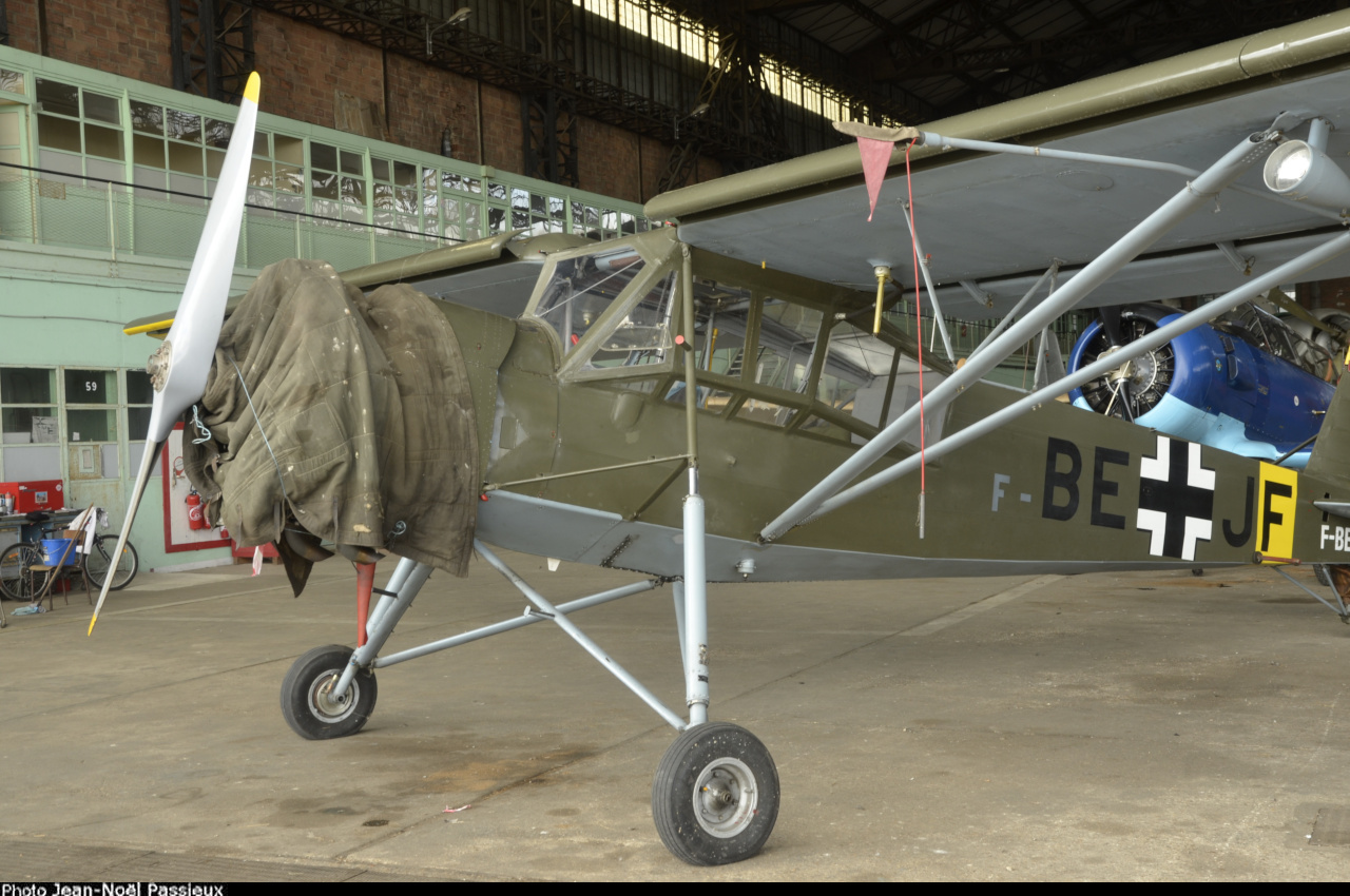 Vue d'un Morane-Saulnier MS-505 Criquet transformé et redécoré en Fieseler Fi 156C-3 Storch (Cigogne). Immatriculation F-AZRA, cn 2039.14, meeting Ferté-Alais 2001. Ce Morane était une version construite sous licence dans les années d'après-guerre. A noter le dispositif hypersustentateur très efficace, composé de becs situés sur la totalité du bord d'attaque, et de grands volets à fente montés sur l'ensemble du bord de fuite. |