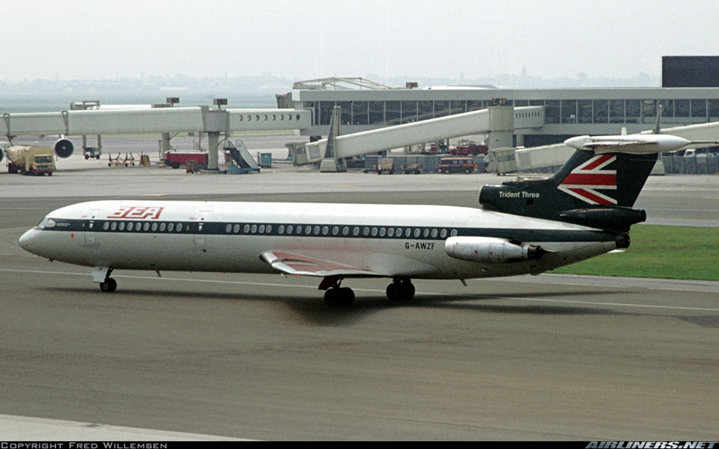 Vue d'un Trident 3B, immatriculation G-AWZF, cn 2307, employé par la compagnie BEA, British European Airways. Amsterdam-Schiphol, Pays-Bas, début des années 1970. |