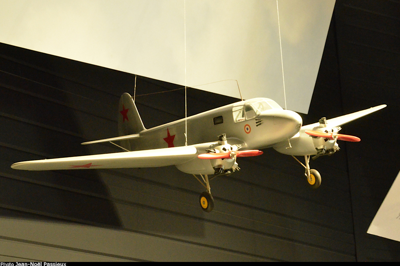 Vue de la maquette suspendue d'un petit avion de liaison bimoteur Yakovlev Yak-6. Musée de l'Air et de l'Espace du Bourget, mars 2026. |